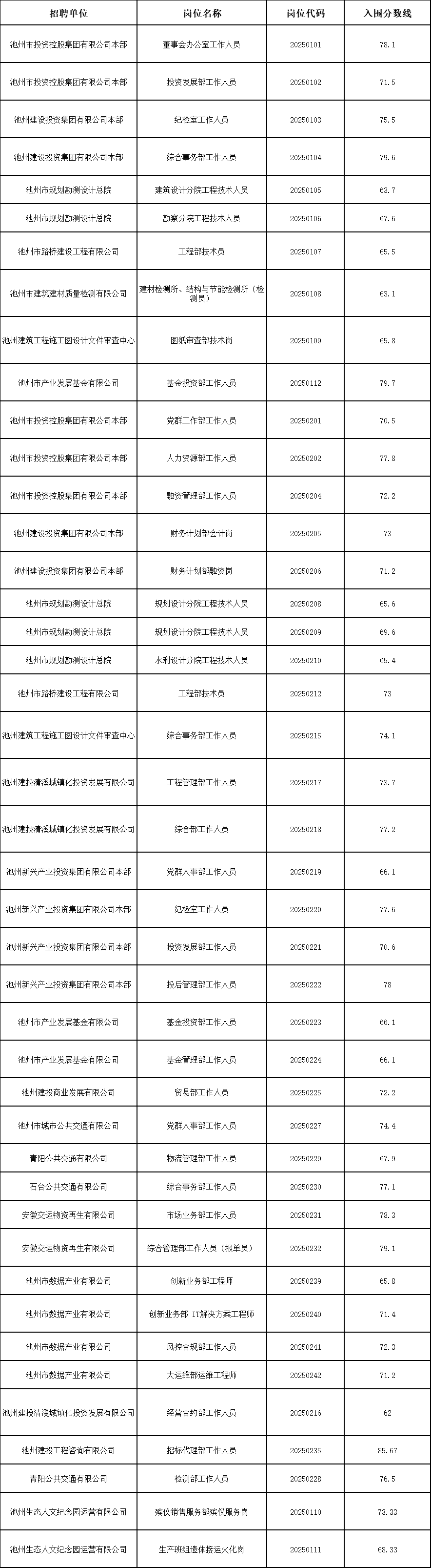 根據(jù)《池州市投資控股集團2025年公開招聘工作人員公告》要求,公開招聘筆試工作已結束,現(xiàn)將資格復審及面試相關事宜公告如下。