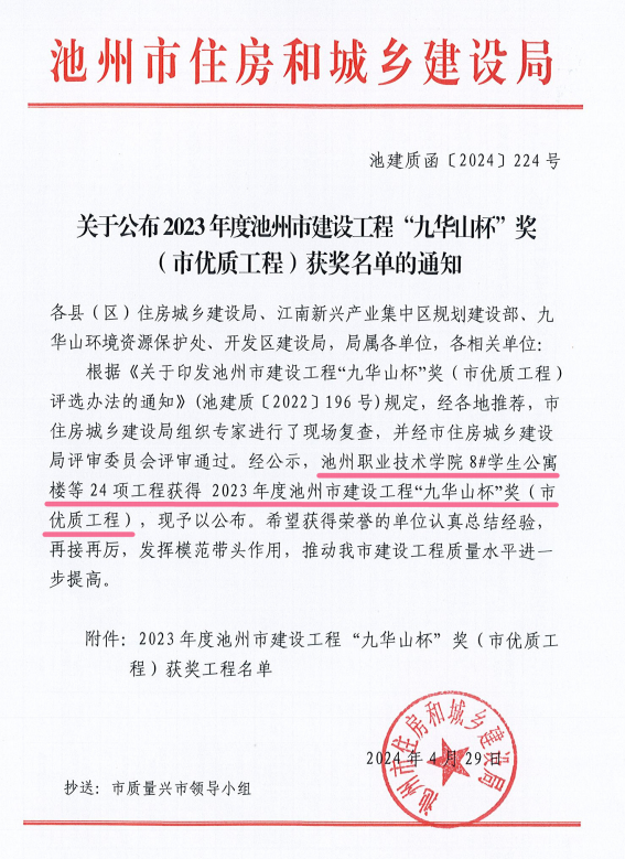 近日,池州市住房和城鄉(xiāng)建設局印發(fā)了《關(guān)于公布2023年度池州市建設工程“九華山杯”獎(市優(yōu)質(zhì)工程)獲獎名單的通知》(池建質(zhì)函〔2024〕224號),由池州建投集團承建的池州職業(yè)技術(shù)學院8#學生公寓樓項目喜獲2023年度池州市建設工程“九華山杯”(市優(yōu)質(zhì)工程)獎。